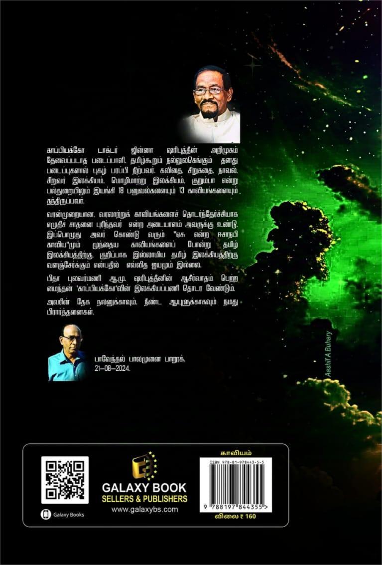காப்பியக்கோ ஜின்னா ஷரிபுத்தீன் அறிமுகம் தேவைப்படாத படைப்பாளி. தமிழ்கூறும் நல்லுலகெங்கும் தனது படைப்புகளால் புகழ் பரப்பி நிற்பவர். கவிதை, சிறுகதை, நாவல், சிறுவர் இலக்கியம், மொழிமாற்று இலக்கியம், குறும்படம் என்று பல்துறையிலும் இயங்கி 18 பனுவல்களையும், 13 காவியங்களையும் தந்திருப்பவர்.